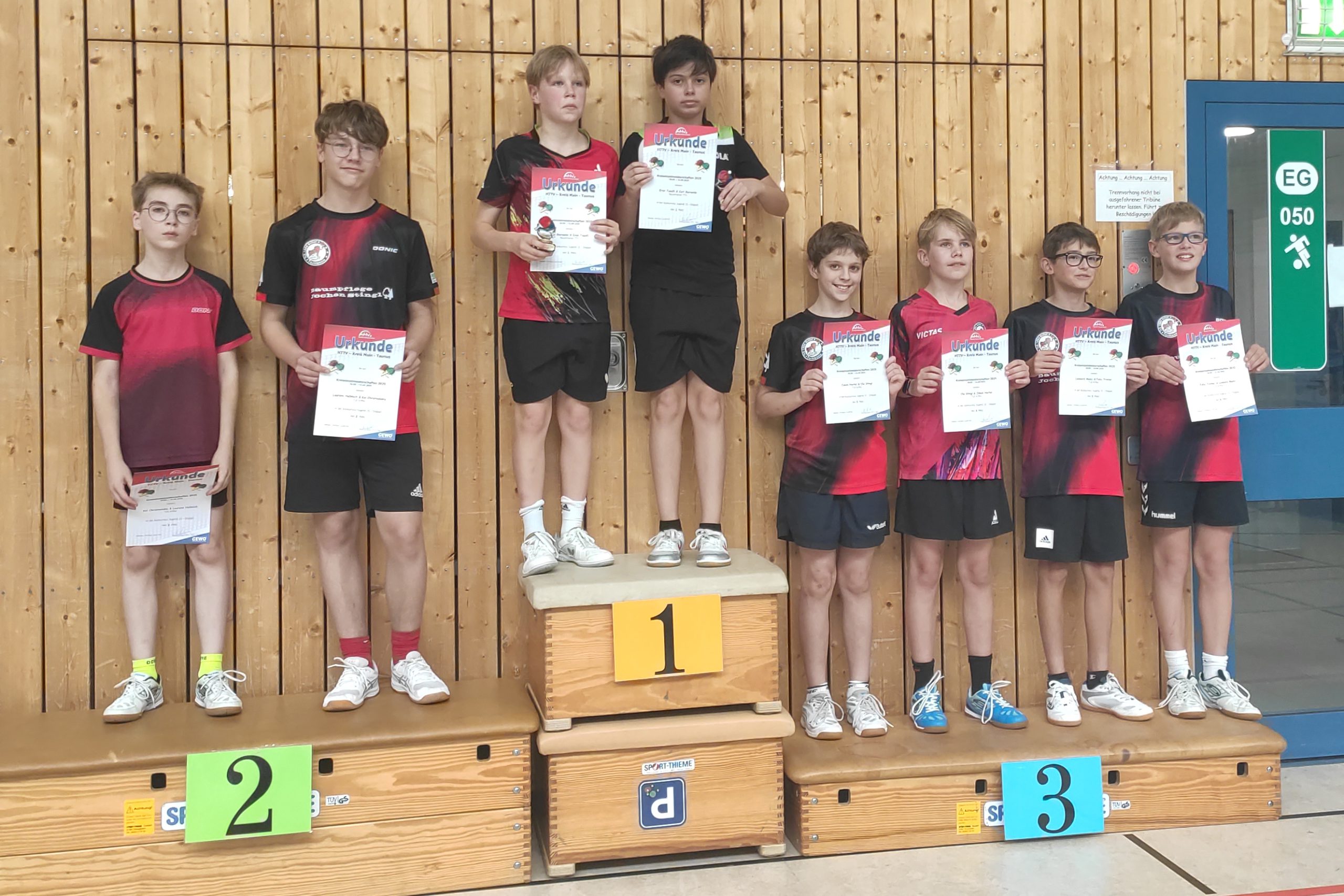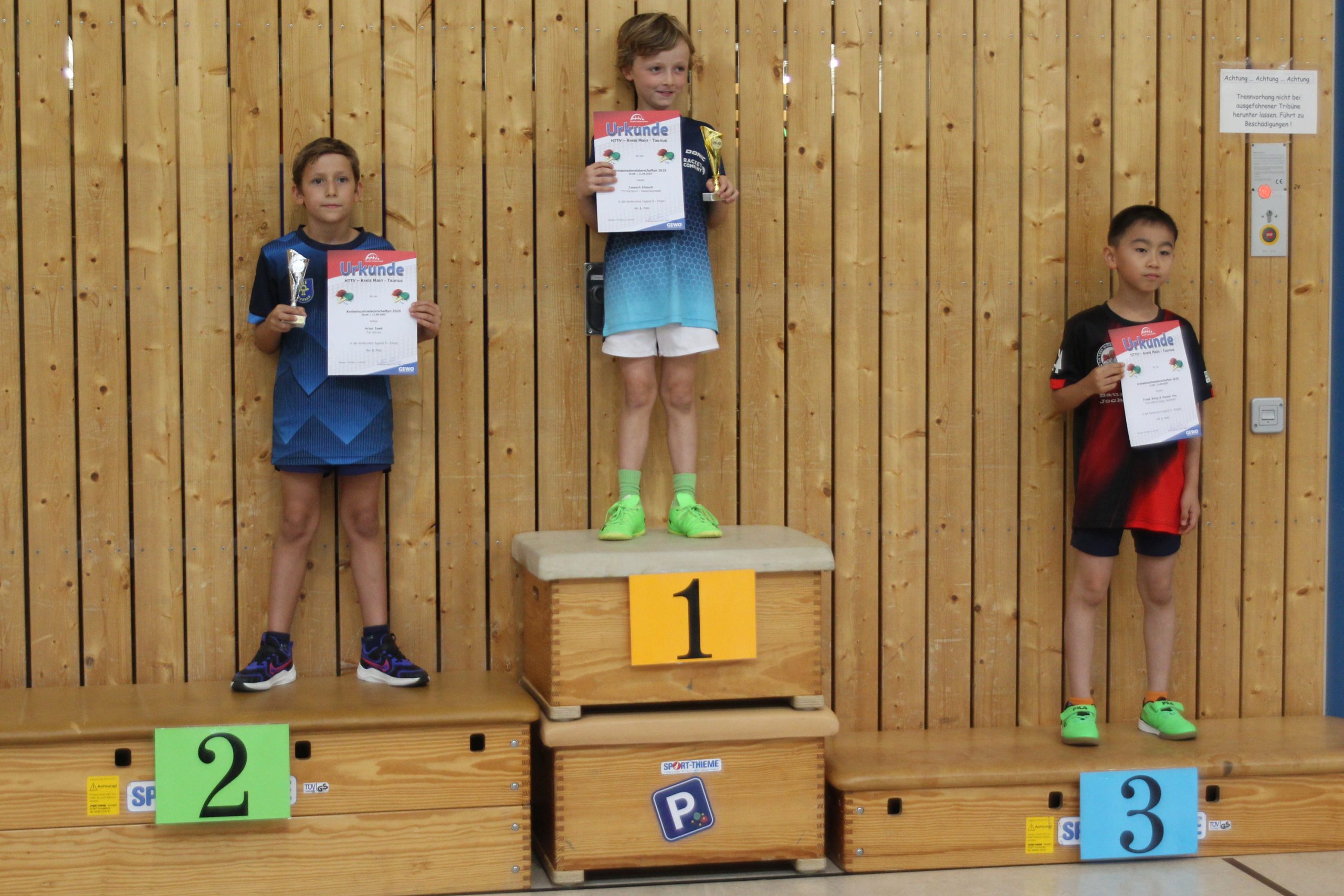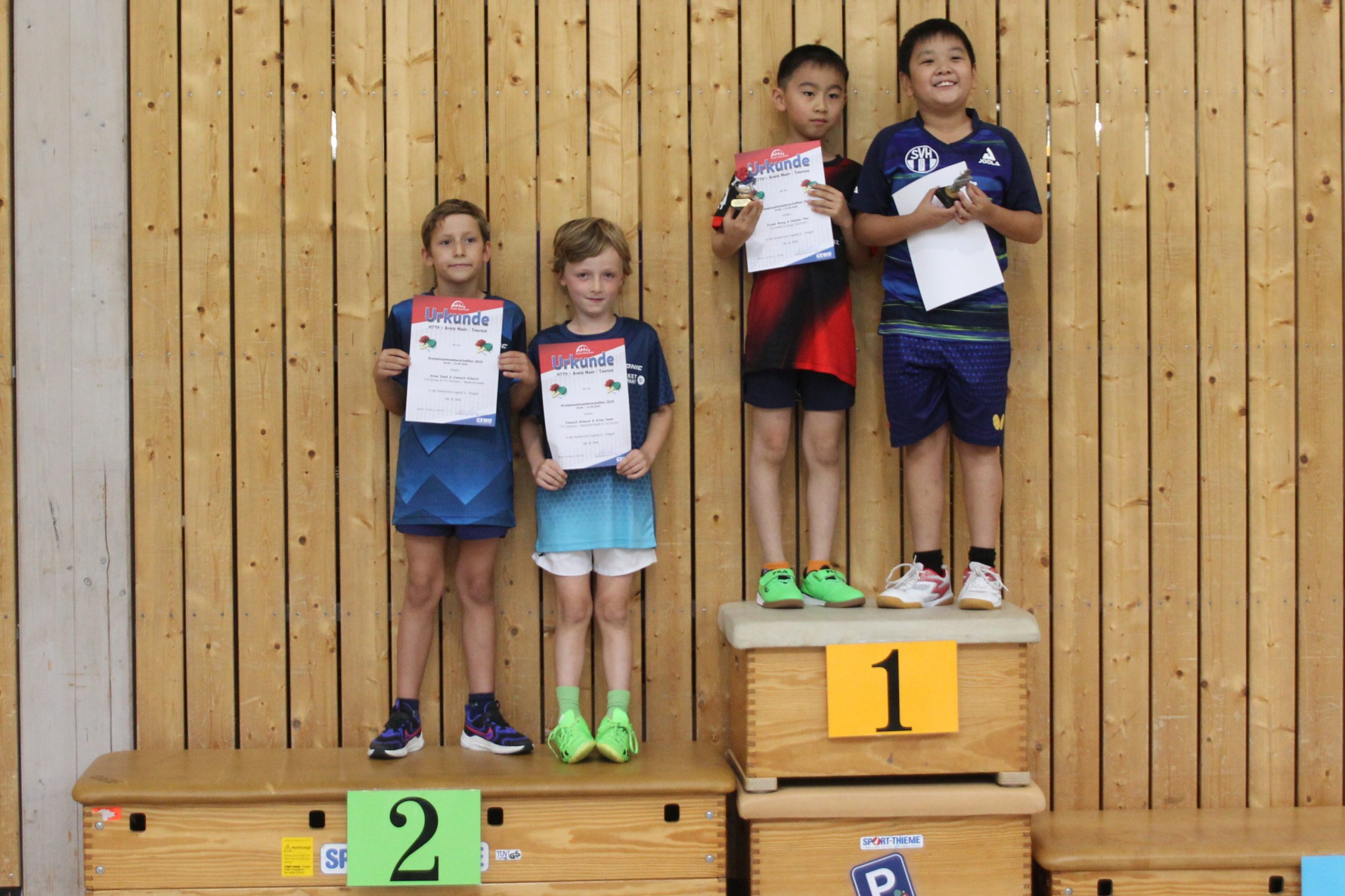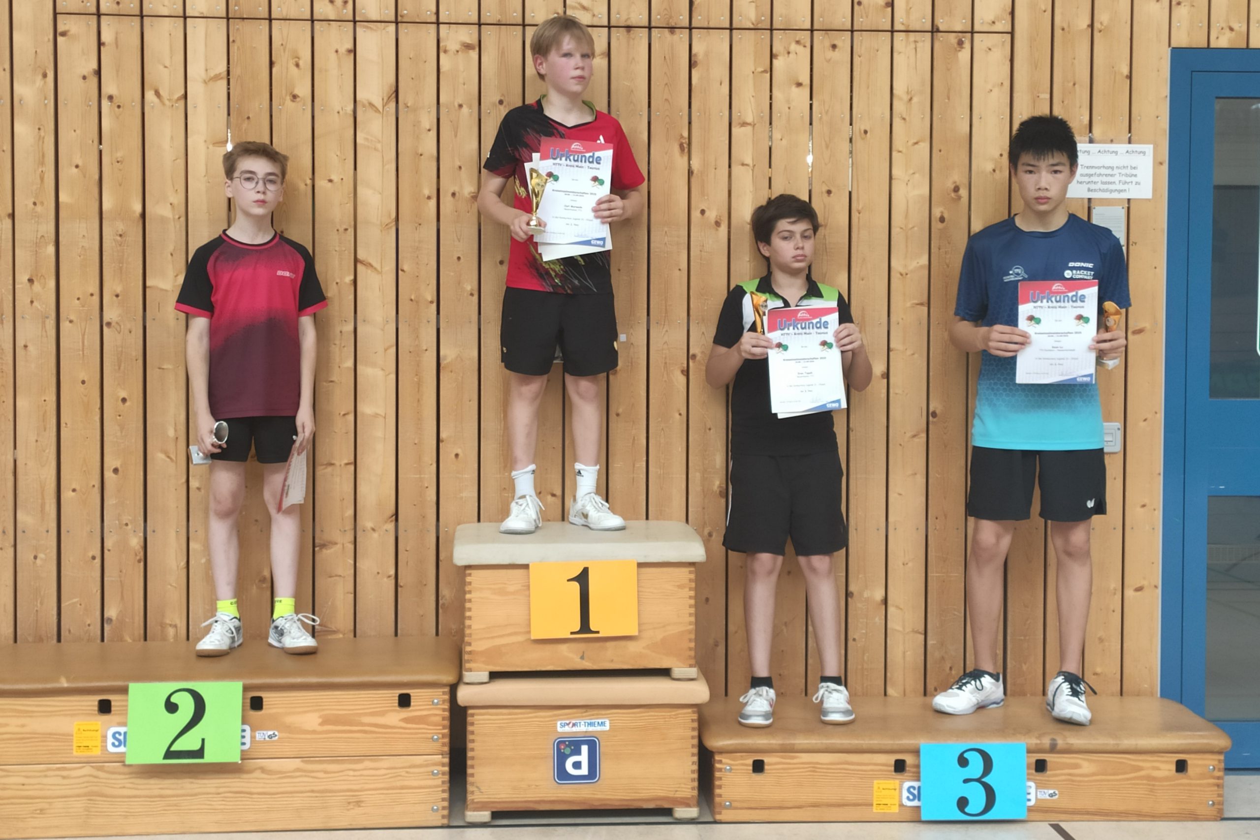 Im Einzel wurde zunächst in Gruppen gespielt. Hier war für Sungjin ebenfalls nichts zu holen und auch Laurens schied als Gruppendritter mit einem Sieg aus. Ole musste eine Niederlage hinnehmen, kam aber als Gruppenzweiter ins KO-Feld. Kai, Jakob, Felix und Leo setzten sich als Gruppenerste durch. Ole musste nun noch ein Vorspiel zum Einzug ins Achtelfinale absolvieren, das er gewinnen konnte. Im Achtelfinale zogen Ole und auch Leo den Kürzeren, während Kai, Jakob und etwas überraschend auch Felix ins Viertelfinale einzogen. Dort kam dann für Jakob und Felix das Aus, sie durften aber noch ein Qualifikationsspiel für die Bezirksmeisterschaften absolvieren. Das Los ergab ein direktes Duell der beiden, in dem Felix sich durchsetzte. Für Kai ging es dagegen ins Halbfinale, wo er nach hartem Kampf den Neuenhainer Eron Topalli bezwingen konnte. Im Finale tat sich Kai gegen Carl Marwede (Neuenhainer TTV) dann ungewohnt schwer und musste sich schließlich im Entscheidungssatz geschlagen geben. Dennoch ist er ebenso wie Felix für die Bezirksmeisterschaften qualifiziert. Jakob kann noch über die Nachrückerliste auf einen Startplatz hoffen.