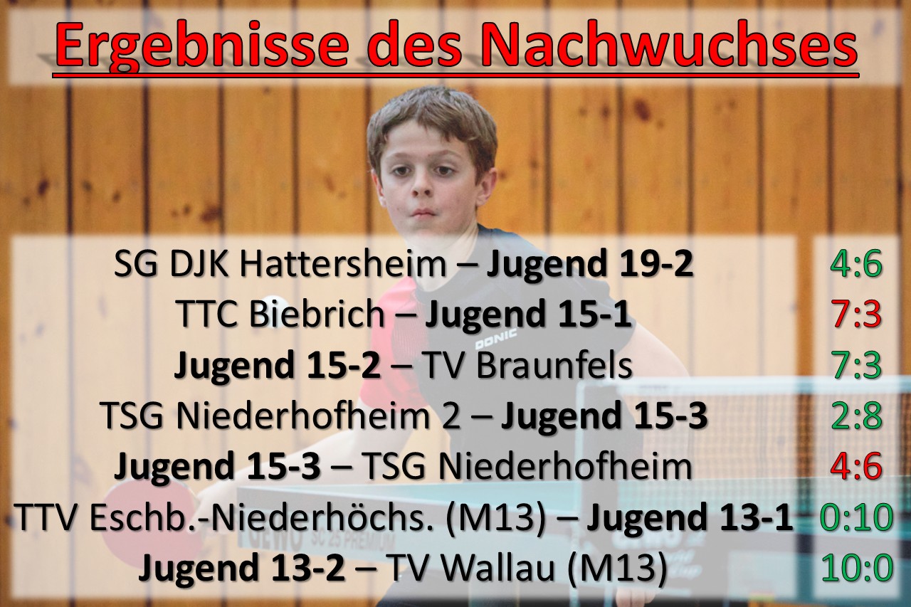 Bei der SG DJK Hattersheim trat die Jugend 19-2 gestärkt durch den formstarken Jakob Hartel sowie mit dem neuen Spitzenspieler Luca Feuser an. Das Team komplettierte Alejandro Cekalla. Jakob ließ in seinen Spielen überhaupt nichts anbrennen und gewann das Doppel mit Luca sowie alle drei Einzel sicher mit 3:0. Luca musste sich in seinem ersten Einzel nach längerer Spielpause knapp geschlagen geben, gewann seine beiden weiteren Spiele aber ebenfalls sicher. Alejandro spielte ebenfalls gut mit, konnte aber kein Spiel gewinnen, auch wenn er im zweiten Einzel nur knapp unterlag.