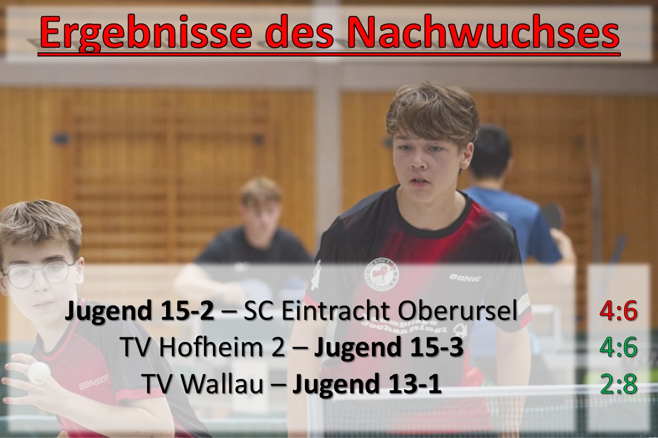 Im vorletzten Vorrundenspiel kam es für die Jugend 15-2 zum Duell gegen den Tabellenführer SC Eintracht Oberursel. Zum Start verlor das Doppel Jakob Hartel/Leonard Manic gegen die bislang ungeschlagene Paarung der nur zu dritt angetretenen Gäste. Parallel dazu drehte Ole Stingl einen 0:2-Rückstand zu seinem ersten Einzelerfolg dieser Runde. Im Anschluss zog Oberursel mit vier Punktgewinnen aber auf 5:1 davon. Ersatzspieler Laurens Hellmich, Jakob und Leo, der einen noch ungeschlagenen Spieler bezwang brachten das Team noch einmal auf 4:5 heran, der gegnerische Spitzenspieler war für Ole aber zu stark, sodass man letztlich eine knappe Niederlage hinnehmen musste. Dennoch hält die Jugend 15-2 den dritten Tabellenplatz.