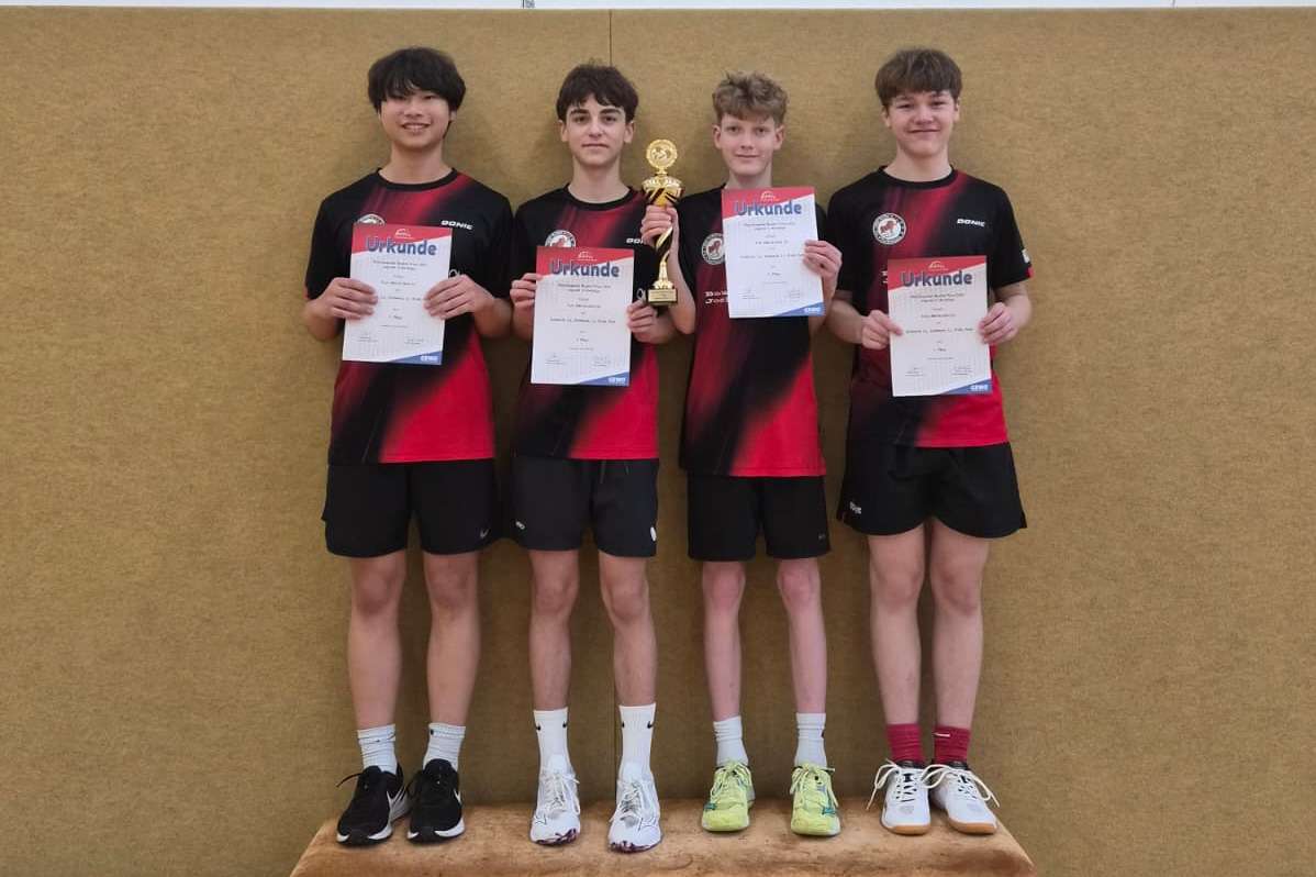Im Finale kehrte das Team wieder zur Aufstellung aus dem Viertelfinale zurück. Die ersten beiden Spiele verliefen erwartungsgemäß: Laurens gewann sicher mit 3:0, während sich Linus einem Noppenspieler mit 1:3 geschlagen geben musste. Danach gelang Samuel ein Big Point: Seinen klar favorisierten Kontrahenten konnte er nach hartem Kampf im Entscheidungssatz besiegen und damit den vielleicht vorentscheidenden Punkt einfahren. Im Doppel hatten Laurens und Linus keine Probleme, aber dann wurde es doch noch einmal eng: Sowohl Laurens als auch Linus verloren ihre Einzel unglücklich im Entscheidungssatz, was dazu führte, dass das letzte Einzel von Samuel die Entscheidung bringen musste. Doch der blieb cool, bestätigte seine starke Leistung aus dem ersten Einzel und setzte sich schließlich mit 3:1 gegen seinen leicht favorisierten Kontrahenten durch. Anschließend kannte der Jubel keine Grenzen mehr. Nach nur etwas mehr als einem Jahr im Spielbetrieb konnte sich das Team zum Bezirkspokalsieger krönen und darf nun am 21. März zur Hessischen Pokalendrunde nach Kassel fahren. Herzlichen Glückwunsch an diese tolle Mannschaft!