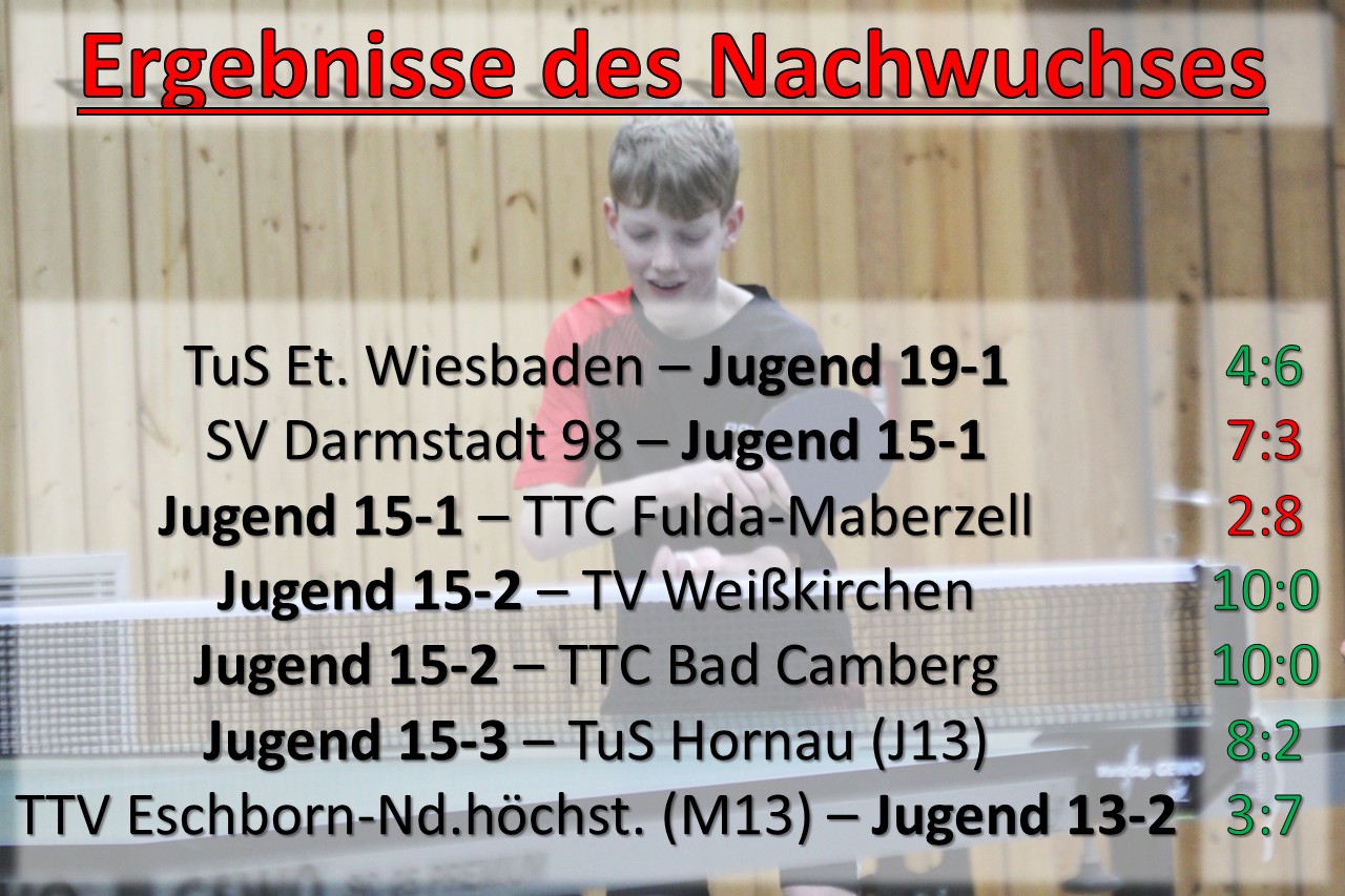 Aufgrund zweier Ausfälle ging die Jugend 19-1 „ersatzgestärkt“ durch Kai Christoulakis und Jakob Hartel in die Partie bei der Eintracht Wiesbaden, die auf einen Stammspieler verzichten musste. Das Doppel Caius Helms/Felix Trinter sowie Kai brachten das Team zunächst in Führung und Felix legte auch im Einzel nach. Im Anschluss kam Wiesbaden aber durch drei Einzelerfolge zum Ausgleich. Für die Vorentscheidung sorgten anschließend Caius und Jakob, die umkämpfte Fünfsatzpartien gewinnen konnten. Den Siegpunkt besorgte Kai, während sich Felix zum Abschluss trotz guter Leistung geschlagen geben musste. Das 6:4 bedeutete den zweiten Saisonsieg für unser Team.