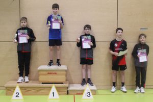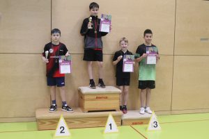 In der jüngsten Altersklasse IV (Jahrgang 2017 und jünger) war Frank Wang dabei. Mit zwei 3:0-Erfolgen und einer 1:3-Niederlage belegte er in seiner Vorrundengruppe den zweiten Platz und qualifizierte sich damit für das Halbfinale. Hier ließ er seinem Gegner mit 3:0 keine Chance und traf im Endspiel erneut auf seinen Gruppengegner, gegen den er verloren hatte. Im Finale ging Frank zunächst mit 1:0 in Führung, konnte aber keinen weiteren Satz gewinnen und unterlag letztlich erneut mit 1:3. Dennoch ist Frank damit für die Bezirksjahrgangsmeisterschaften im April qualifiziert. Herzlichen Glückwunsch!