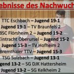 Jugend 19-1 muss zweite Niederlage in Folge hinnehmen / Jugend 19-2 in Notbesetzung verliert in Hochheim / 1. Jugend 15 ohne Spitzenspieler chancenlos gegen Bruchköbel / Jugend 15-2 erkämpft sich am Doppelspieltag weitere vier Punkte / Jugend 13-1 lässt der zweiten Kelkheimer Mannschaft keine Chance / Jugend 13-2 unterliegt erwartungsgemäß bei der SG Kelkheim / Nachwuchsspieler der Woche: Linus Hellmich