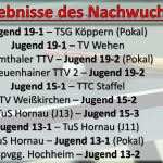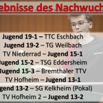 Jugend 19-1 erkämpft zweiten Punktgewinn gegen Eschbach / Jugend 19-2 unterliegt starker TG Weilbach deutlich / Kai brilliert bei erstem Hessenliga-Auswärtsspiel in Niederrad / Jugend 15-2 setzt sich gegen Eddersheim souverän durch / Jugend 15-3 gewinnt auch das dritte Saisonspiel gegen Bremthal / Jugend 13-1 besiegt im Lokalderby den TV Hofheim / Jugend 13-2 scheidet im Pokal aus, feiert aber im zweiten Ligaspiel ihren ersten Sieg / Nachwuchsspieler der Woche: Kai Christoulakis