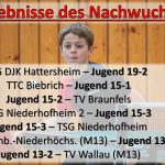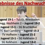 Jugend 19-1 muss zweite Niederlage in Folge hinnehmen / Jugend 19-2 in Notbesetzung verliert in Hochheim / 1. Jugend 15 ohne Spitzenspieler chancenlos gegen Bruchköbel / Jugend 15-2 erkämpft sich am Doppelspieltag weitere vier Punkte / Jugend 13-1 lässt der zweiten Kelkheimer Mannschaft keine Chance / Jugend 13-2 unterliegt erwartungsgemäß bei der SG Kelkheim / Nachwuchsspieler der Woche: Linus Hellmich