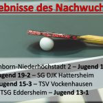 Jugend 19-1 beendet die Vorrunde mit einem Sieg und einer Niederlage / Jugend 19-2 gelingt ordentlicher Vorrundenabschluss / Jugend 15-1 beendet die Hinrunde auf Platz 8 / Jugend 15-2 muss sich zum Abschluss der Vorrunde geschlagen geben / Jugend 15-3 hat zum Vorrundenabschluss keine Probleme in Vockenhausen / Jugend 13-1 sichert sich in spannendem Spitzenspiel die Herbstmeisterschaft / Nichts zu holen für Jugend 13-2 beim Tabellenführer / Nachwuchsspieler der Woche: Luis Biedenkapp